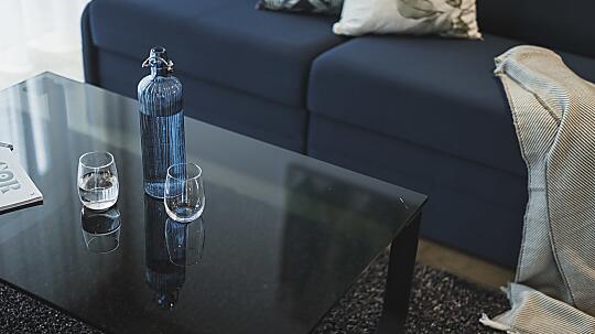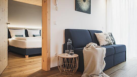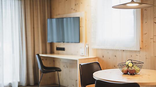 Das Studio View ist ideal für 2 Personen. Am Holztisch könnt ihr gemeinsam essen, auf der Couch relaxen und auf dem Balkon im Loungesessel die Aussicht genießen.