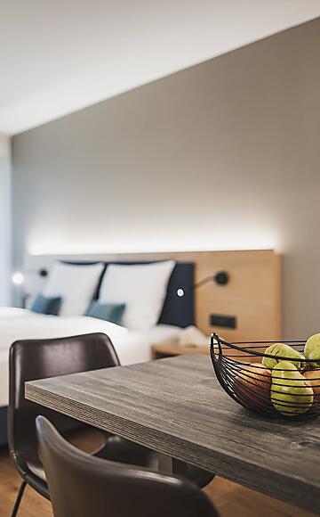 Modern-gemütlich begrüßt euch unser klassisches Studio. Hier erwarten euch dezente Farben, viel Holz und ein sonniger Balkon mit Esstisch. Perfekt für 2!